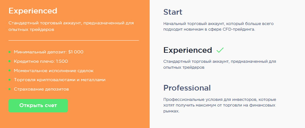 Для заработка здесь предлагают подключить один из трех торговых счетов: «Старт», «Стандарт» и «Профессиональный». В описании указывалось, что для тарифа «Старт» минимальный депозит предусмотрен от 150$, а плечо 1:100. Для «Стандарт» депозит начинается от 1000$, для «Профессионального» от 10 000$. Кредитное плечо у них одинаковое – 1:500.