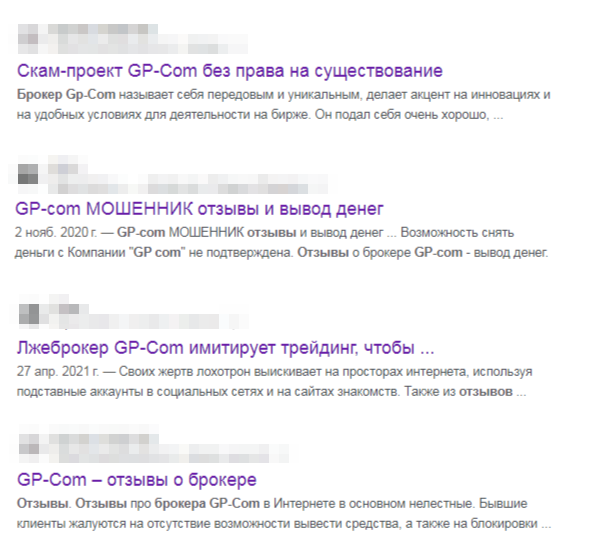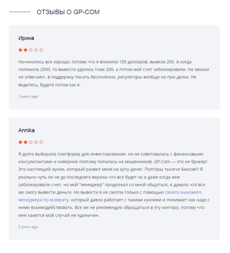 Скорее всего, брокер GP Com ltd уже давно прекратил свою работу, так как все найденные нами отзывы довольно старые. Причем все они оказались отрицательного характера. В комментариях под обзорами с разоблачениями фирмы клиенты рассказывают, что все их обещания оказались ложью.