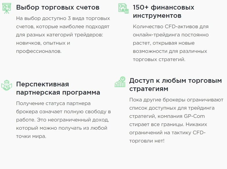 К рабочей платформе для торговли нам попасть не удалось. Все, что у нас получилось увидеть, так это многообещающие предложения на главной странице «ГП Ком». Так, авторы заявляют, что их проект обладает уникальными преимуществами. В этот список вошли следующие пункты: