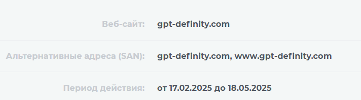 У сайта есть трехмесячный SSL-сертификат. Он действителен до 18 мая 2025 года. Но не гарантирует безопасность пользования веб-ресурсом. Такой SSL-сертификат может получить любая компания, включая мошенническую. Для его оформления не нужно предоставлять никакие данные. Не надо платить деньги.