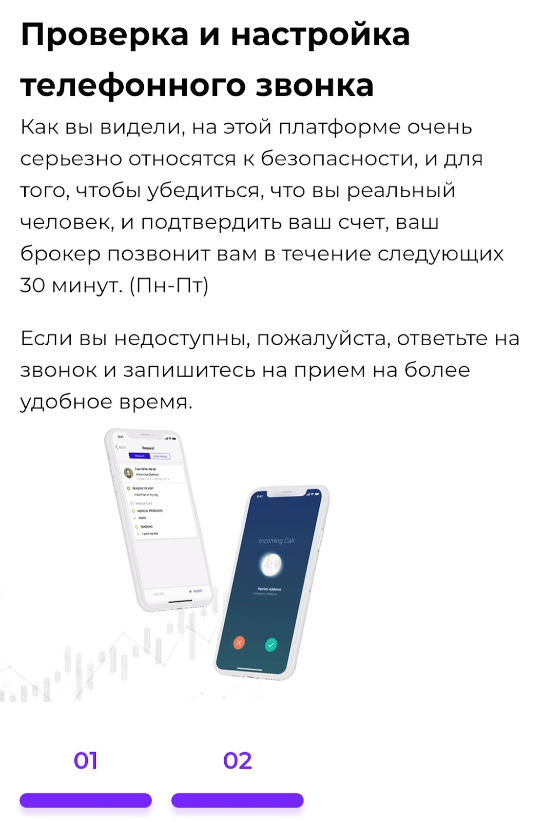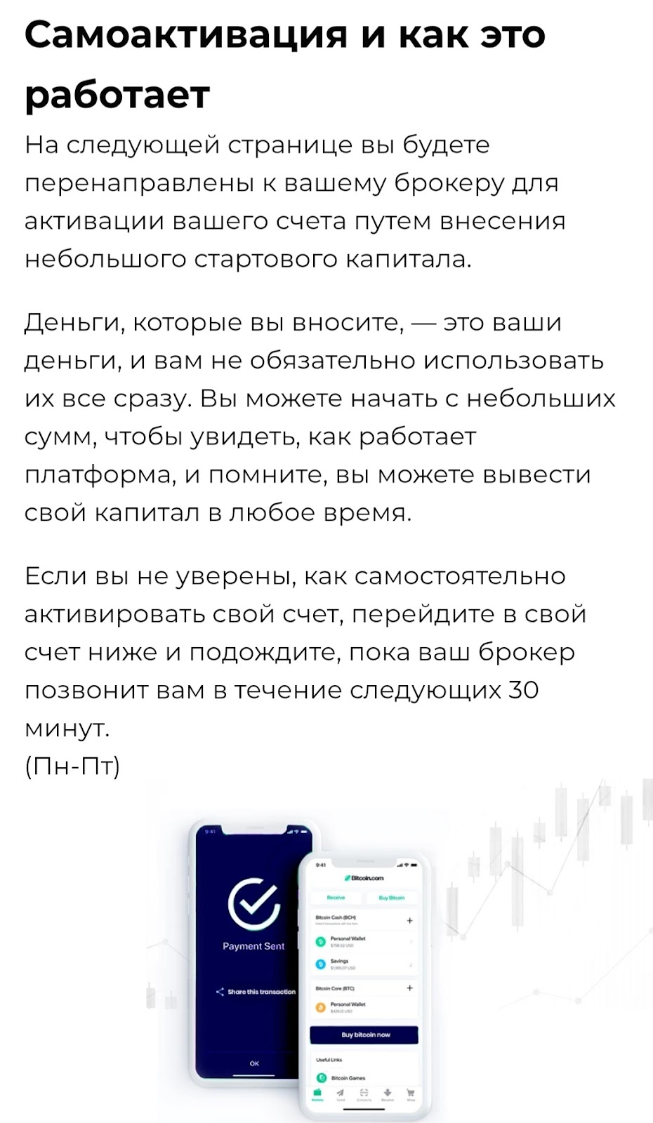 Необходимо дождаться звонка от брокера. Специалист расскажет об условиях сотрудничества, предложит провести анализ для выбора перспективной монеты. Далее расскажет, как пополнить счет. После внесения денег на платформу остается ждать роста токена в цене.