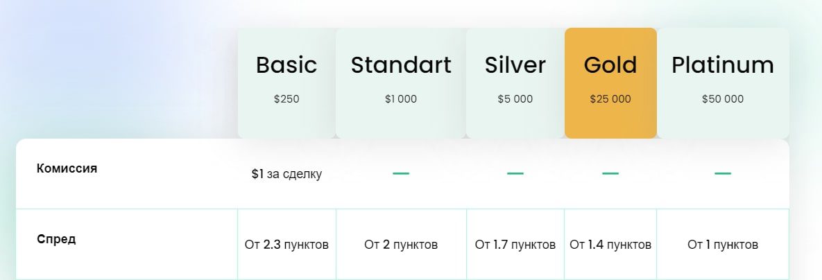 - Gold обойдется в $25 000. В этом тарифе меняется кэшбек на 50%, спред минимизируется до 1,4 пункта;