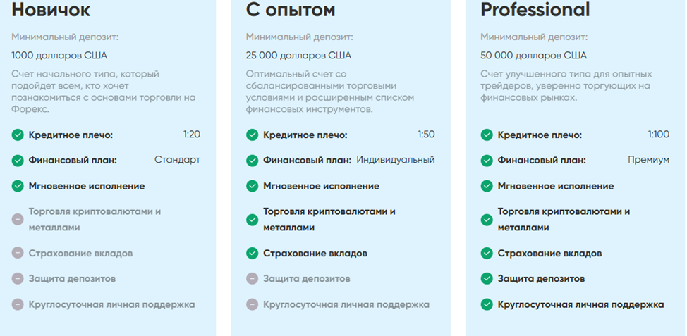 Площадка предлагает три тарифных плана. От суммы начального депозита зависят предоставляемые услуги – финансовый план, кредитное плечо, спред, связь с техподдержкой, качество обслуживания.
