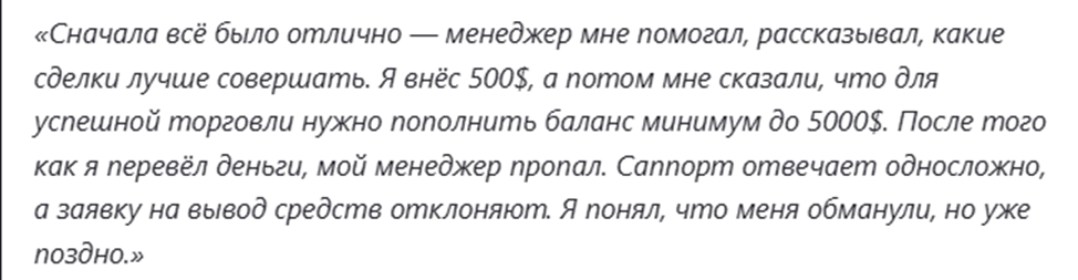 На независимых сайтах комментарии от пользователей о работе брокера чаще всего носят негативный характер. Вкладчики жалуются на трудности с выводом валютных активов. Все истории от пользователей о мошенничестве примерно одинаковы – после внесения крупной суммы на свой баланс служба поддержки перестает выходить на связь, предоставленные телефоны оказываются фейковыми. Многочисленные отрицательные отзывы вызывают сомнение в надежности компании.