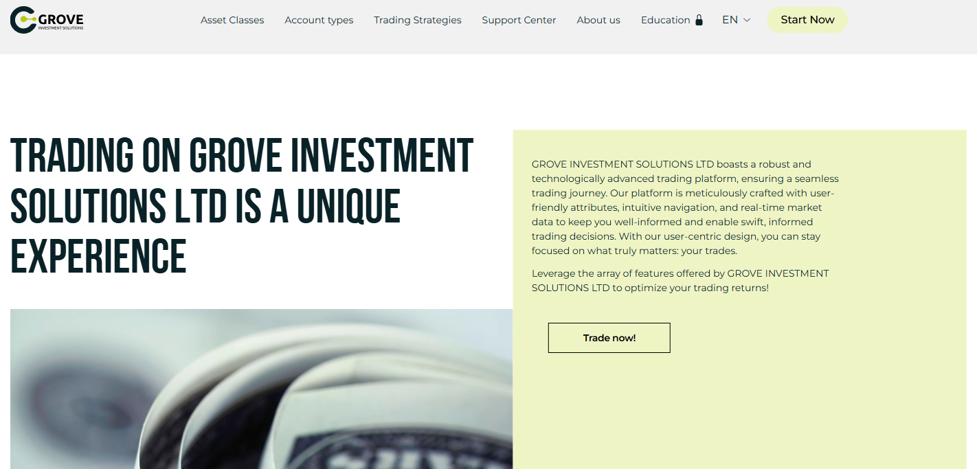 Брокер Grove Investment появился в 2025 году. На его сайте заявлено, что он принадлежит британской компании Grove Investment Solutions Ltd. Владельцы выдали множество хвалебных лозунгов о том, как качественно работает брокер, но не рассказали ничего конкретного.