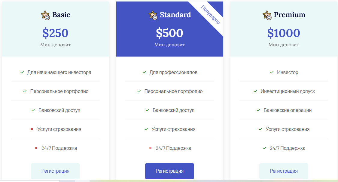 Как и говорилось ранее, посредник предлагает торговать на своей собственной проверенной платформе. Здесь доступна торговля на различных финансовых рынках, включая криптовалюту. На сайте можно выбрать один из трех типов аккаунтов – Basic, Standard и Premium. На первом счете только базовый набор услуг, на двух следующих доступна услуга страхования. А на последнем еще и круглосуточная поддержка.