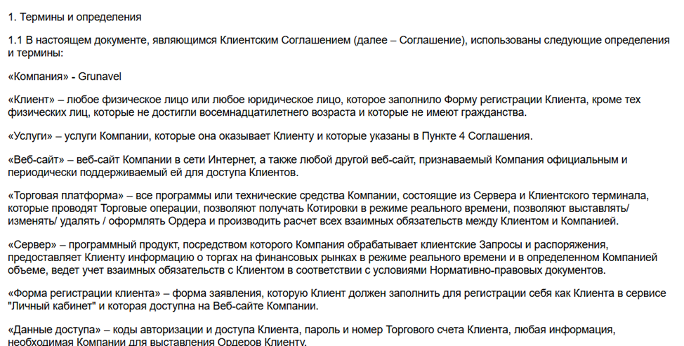 Торговые условия Grunavel Pro