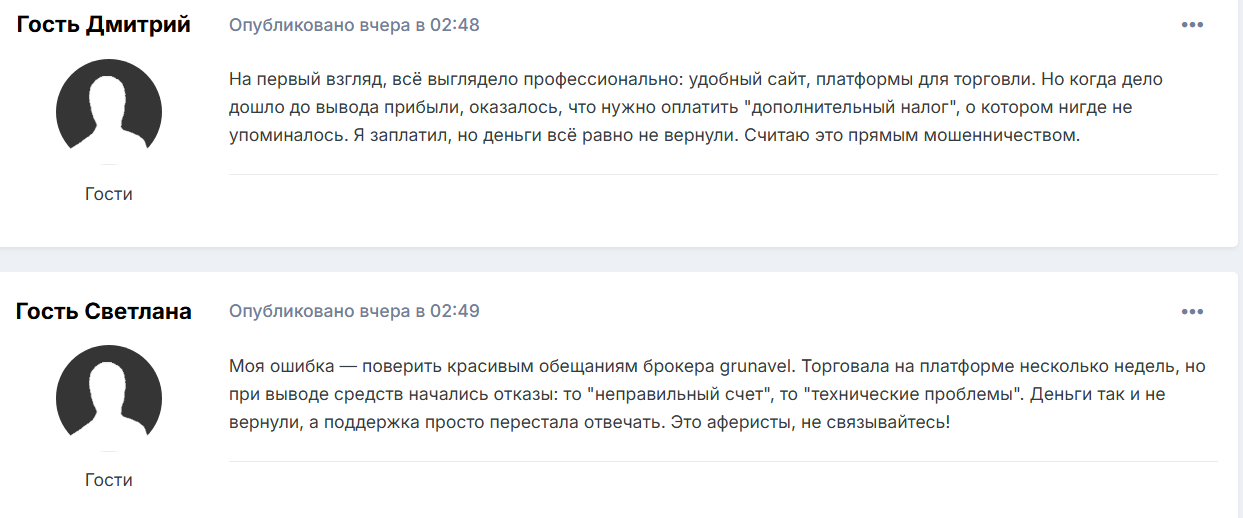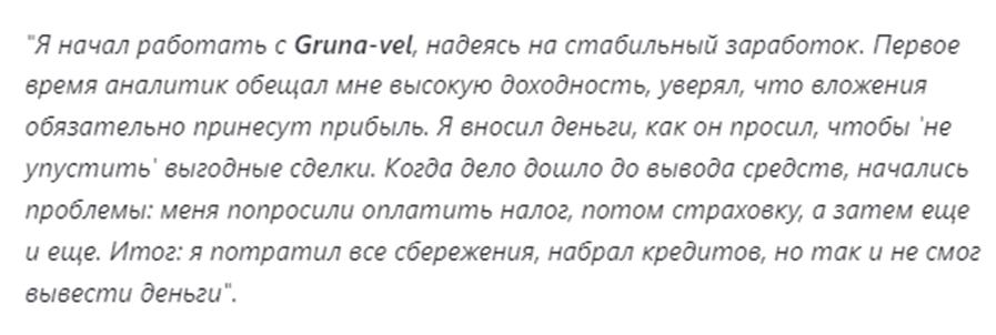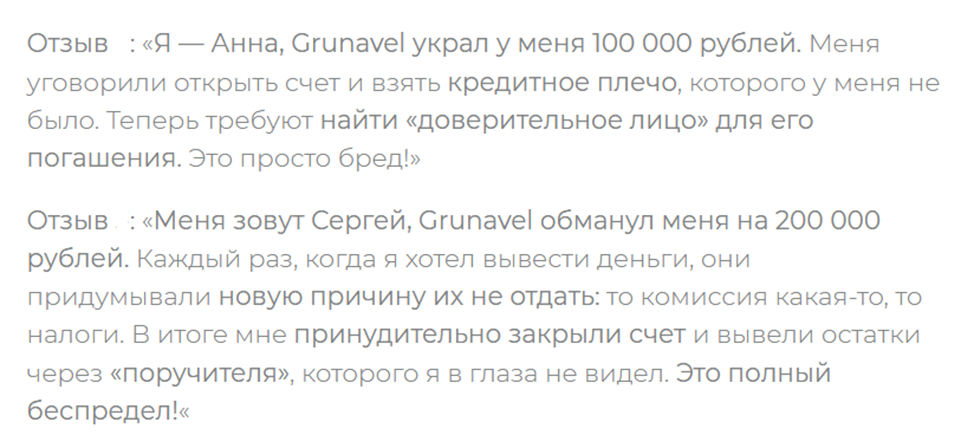 Своей работой компания Grunavel Pro генерирует исключительно отрицательные отзывы. Клиенты жалуются на проблемы с выводом. Брокеры либо ставят платеж на бесконечную проверку либо требуют авансовой уплаты мнимых комиссионных и налогов.