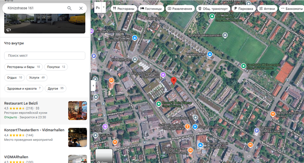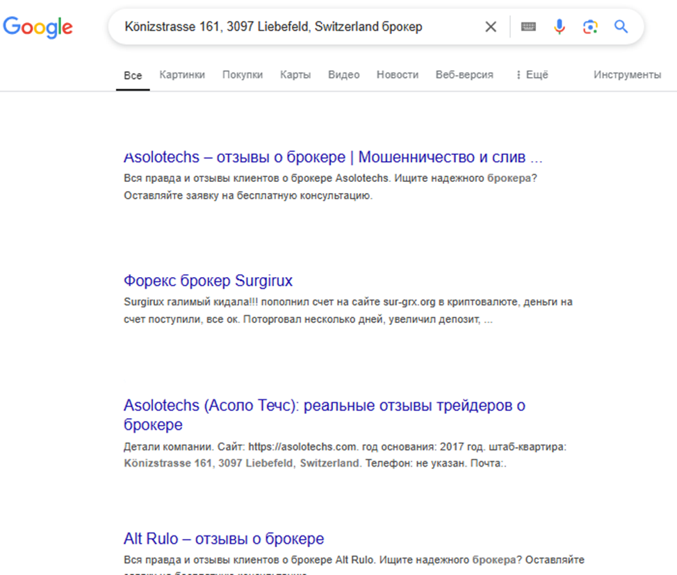 Адрес Könizstrasse 161, 3097 Liebefeld, Switzerland, где якобы расположен головной офис, в качестве официального также заявлен сразу несколькими фейковыми брокерскими конторами, ранее пойманными на скаме. По факту здесь находится культурный центр с театром и ресторанами.