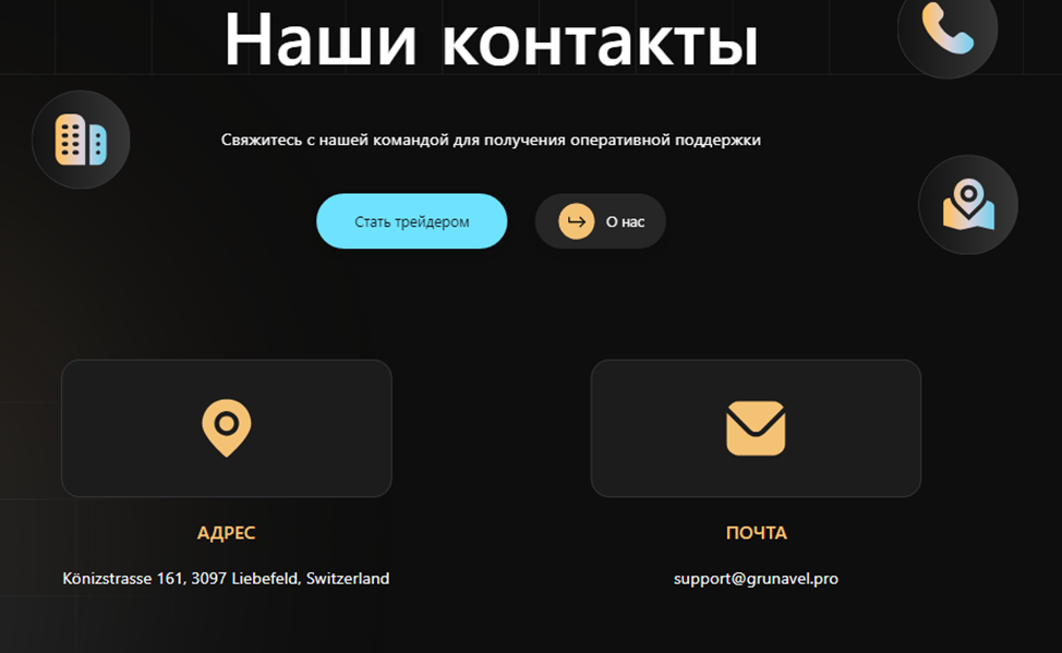 Компания не имеет телеграм-канала, групп в социальных сетях. Клиентам предлагаются исключительно односторонние способы связи в виде электронной почты Support Grunavel Pro и контактной формы на сайте.
