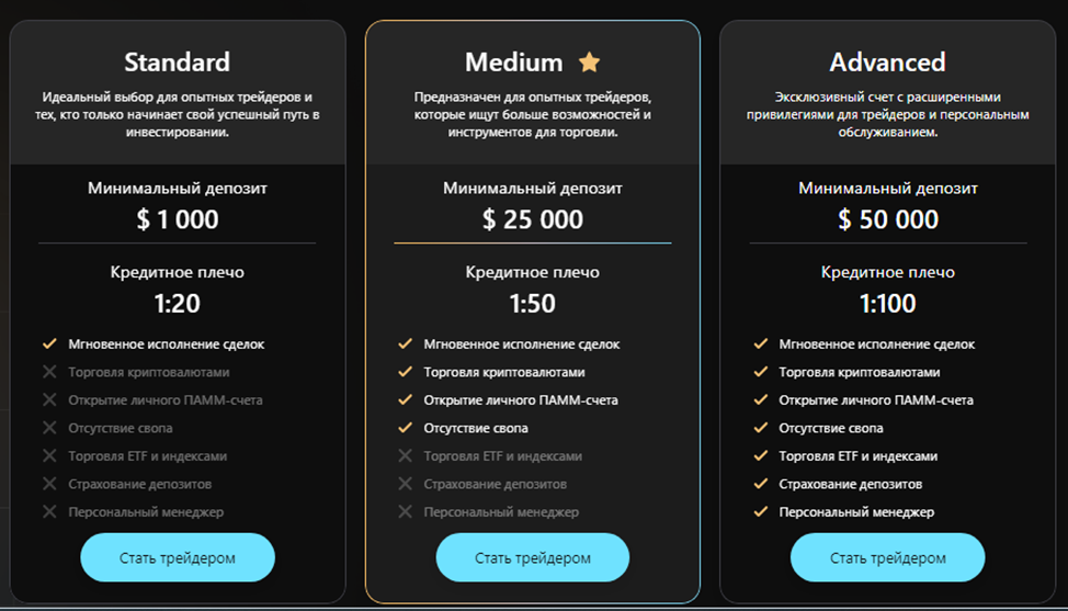 Условия обслуживания зависят от размера депозита, внесенного клиентом. Брокеры имеют несколько тарифных планов: Standard, Medium, Advanced. Минимальный порог входа в систему на порядок выше, чем у конкурентов. Большинство бирж предлагает познакомиться с возможностями системы, внеся 100-300 USD. Здесь же трейдерам для старта потребуется капитал от 1000 USD.