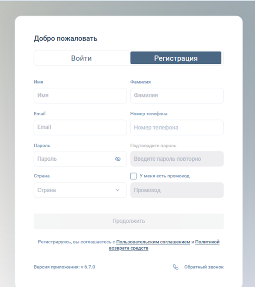 Регистрация торгового счета и авторизация в системе происходят на странице Gruna Vel Info. Новым пользователям необходимо заполнить небольшую анкету. При наличии реферального кода его следует вписать в соответствующее поле. Если этого не сделать перед регистрацией, клиент не сможет рассчитывать на приветственный бонус.