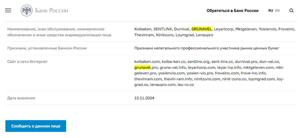 Наличие целой плеяды клонов заметили и в Центробанке РФ. Под грифом «Признаки нелегального участника рынка ценных бумаг и мошенничества» финансовый регулятор объединил Grunavel с другими брокерскими платформами, созданными по единому лекалу.