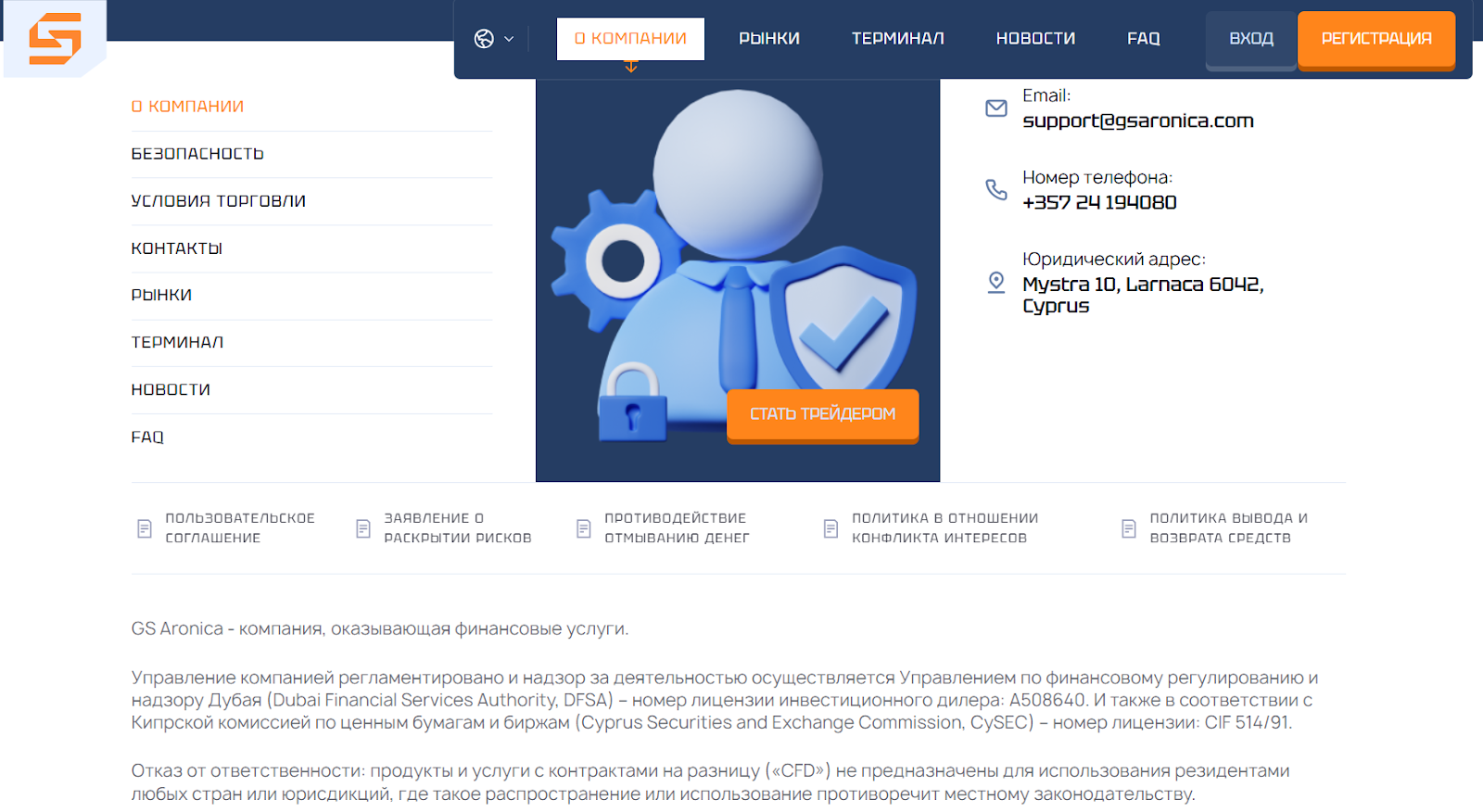 Деятельность gs aronica info не регулируется по закону и нашей страны. На сайте Центробанка РФ названия компании нет. Вообще о ней нет информации в сети. Только в статьях и обзорах, которые рассказывают о мошенничестве. Gsaronica судя по отзывам – ненадежный брокер. Юридический адрес тоже поддельный.