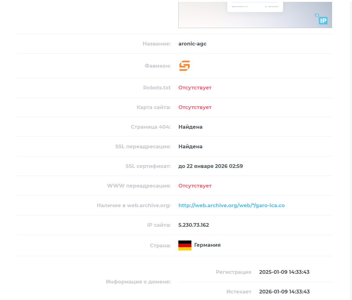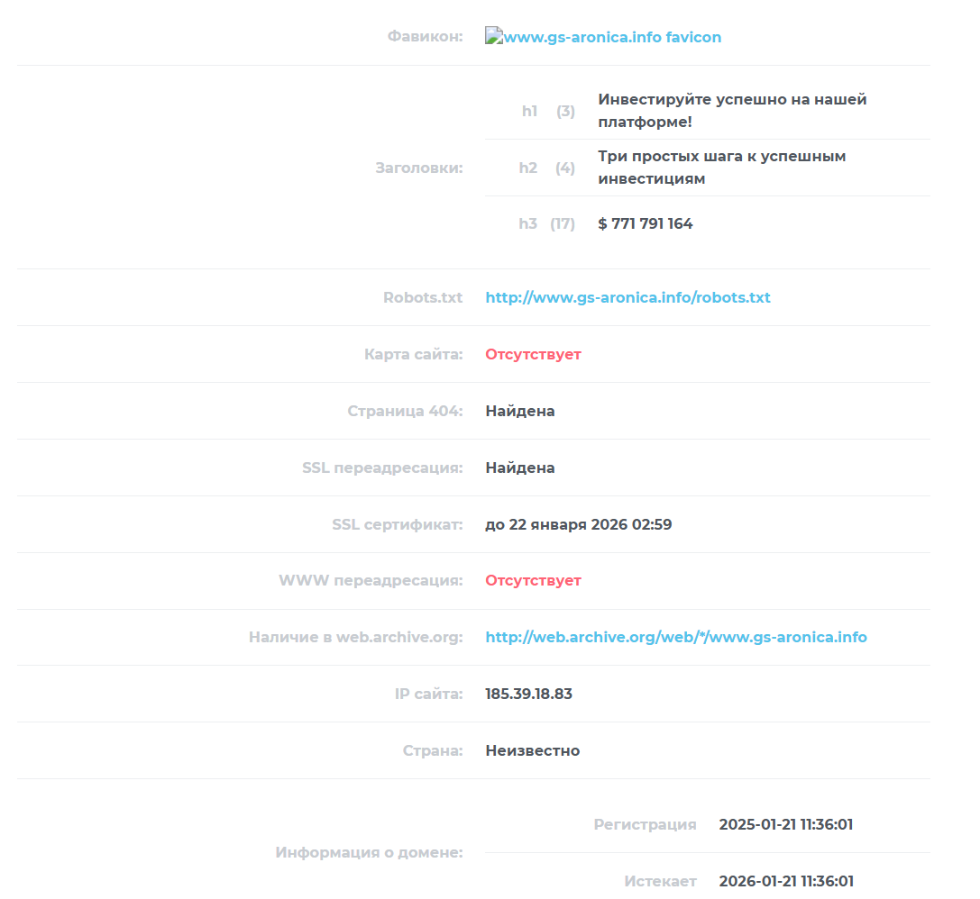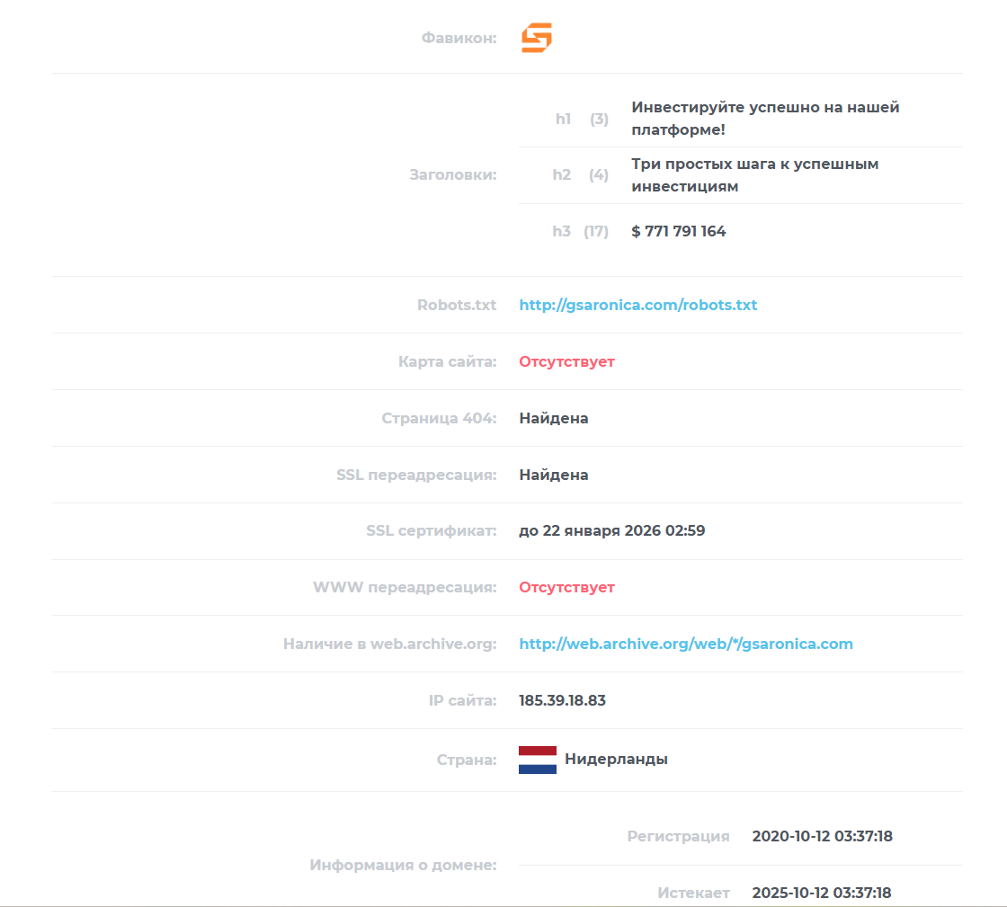 Gsaronica.com – единственная полноценная площадка сейчас. Все домены, кроме него, созданы в 2025 году. Он зарегистрирован а 2020, что тоже не совпадает с названным годом появления самой организации. Скорее всего, аферисты купили первый попавшийся ресурс «с историей», чтобы казаться опытнее.