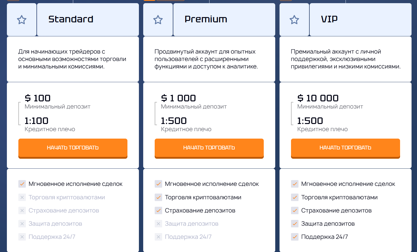 Минимальный вход – 100 долларов. Это уже Standart, который обеспечивает только быстроту операций. Также компания заявляет о комфортных и низких комиссиях, но без деталей.
