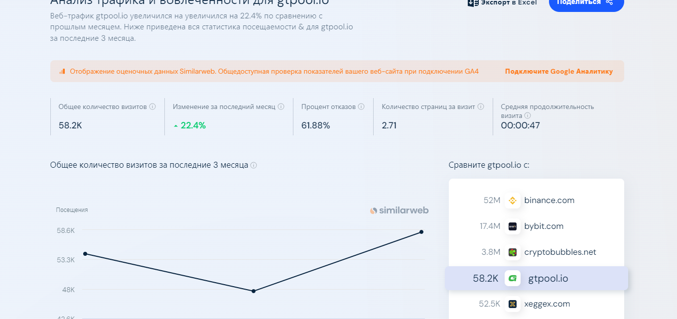 Посещаемость платформы пользователями из России, как показывает статистика «Гугл» растет. Всего посещений сайта за месяц 58.2К. По рейтингу платформа находится в десятке крупных игроков майнинга.