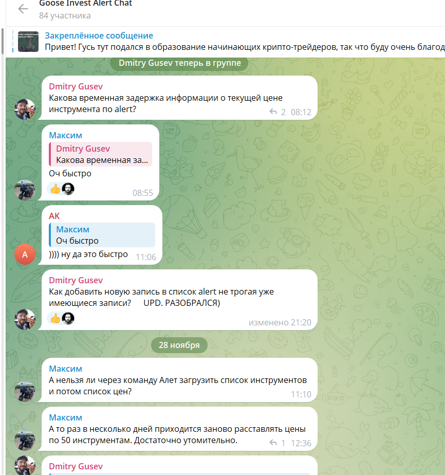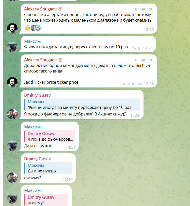 При этом видно, что бот живой: в чате обсуждают новые фичи, задают вопросы, предлагают улучшения. Разработчик Aleksey Shugaev отвечает, спорит, объясняет ограничения, как, например, с “вечными алертами”, которые могут превратиться в спам при высокой волатильности.