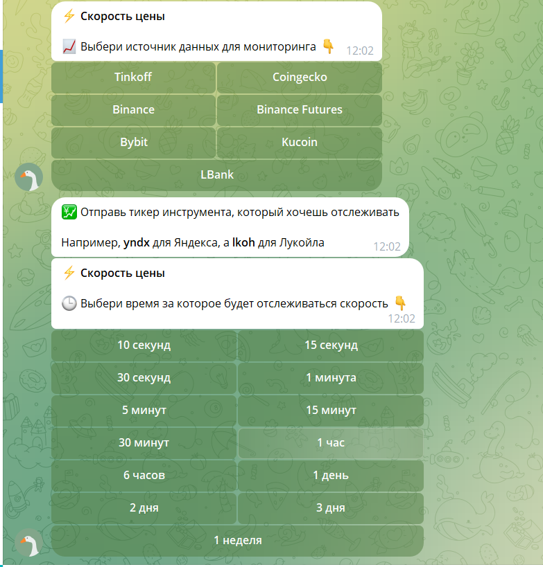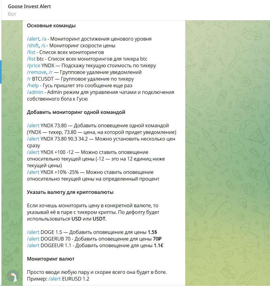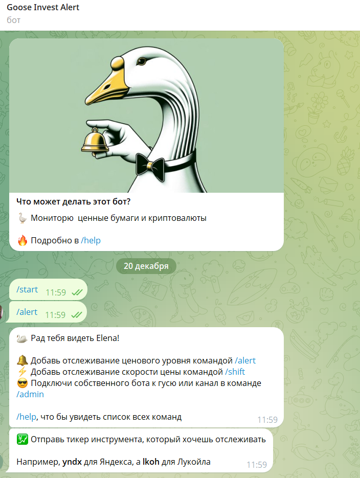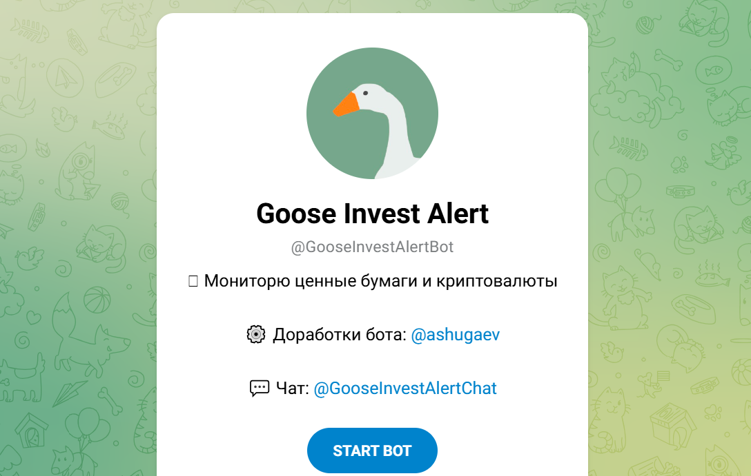 Сам бот работает под ником @GooseInvestAlertBot и его задача это мониторинг ценных бумаг и криптовалют без торговли, сигналов и обещаний доходности.