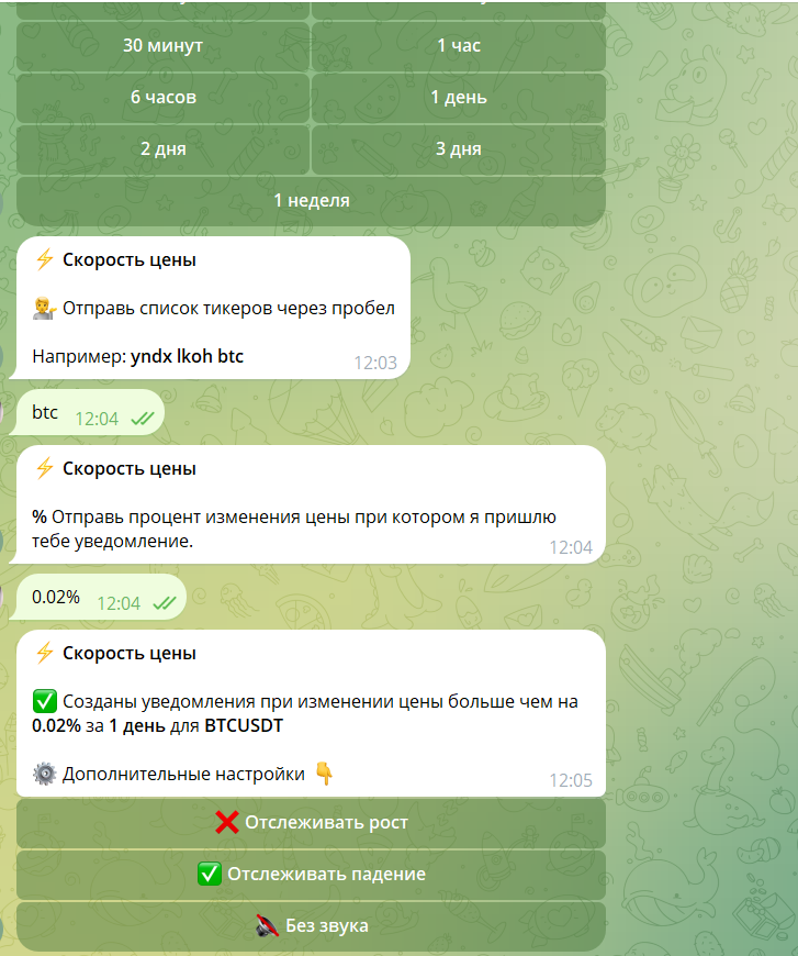 Отдельно стоит функция отслеживания скорости цены. Это не просто алерт “достигли уровня”, а уведомление, если цена изменилась на заданный процент за выбранный промежуток времени — от секунд до дней.