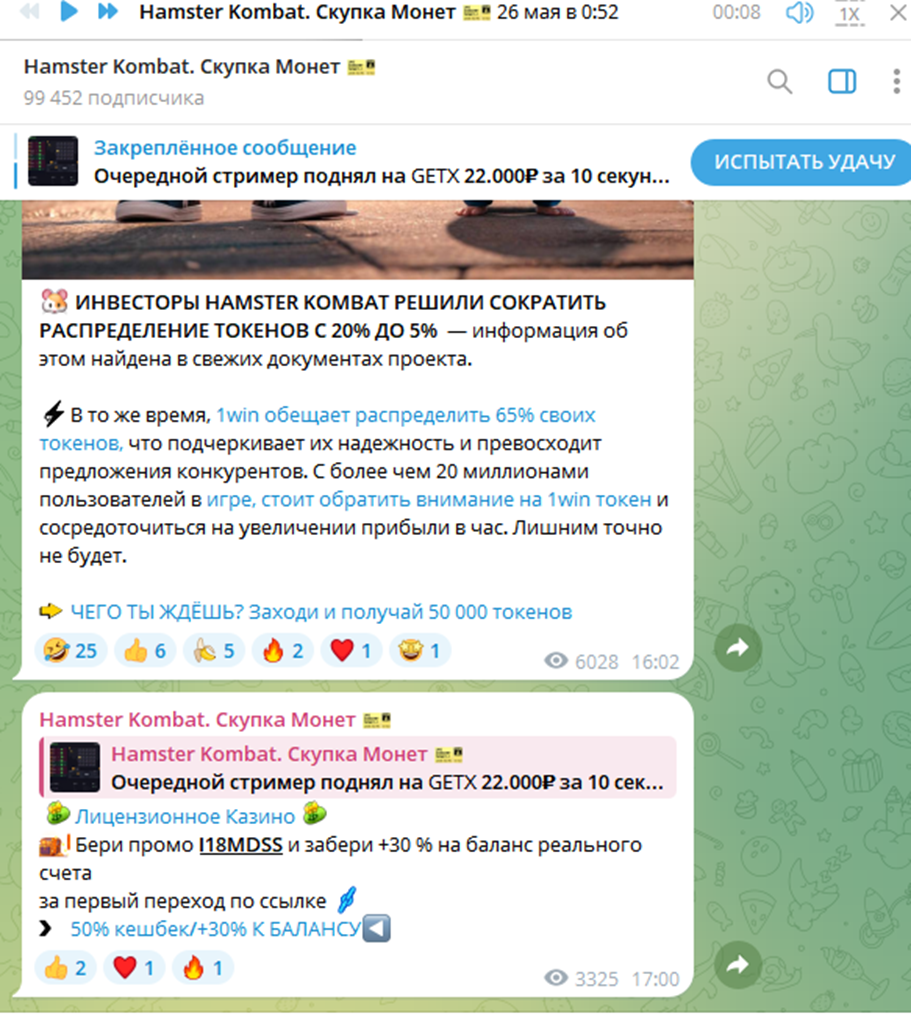 18 сентября 2024 года лента телеграмм-канала “Hamster Kombat Скупка Монет” была посвящена рекламе скам-казино, а также новостям о сокращении распределения токенов инвесторами игры Hamster Kombat с 20% до 5%.
