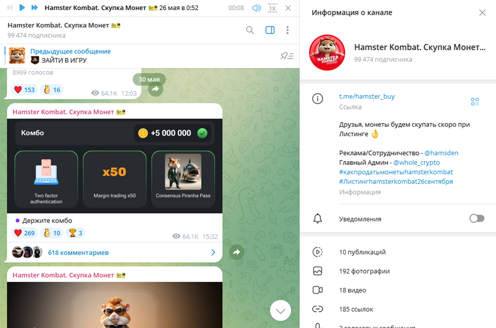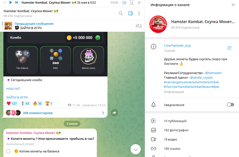 Ввиду того что монеты Хомяка так и не появились ни на одной криптовалютной бирже весной, а потом и летом, на канале стали публиковаться комбинации, а также другая информация, касаемо игры Hamster Kombat. И этот момент нельзя занести в актив, так как новые подписчики зачастую приходят с единой целью — быстрая продажа монет или аккаунтов в Hamster Kombat.