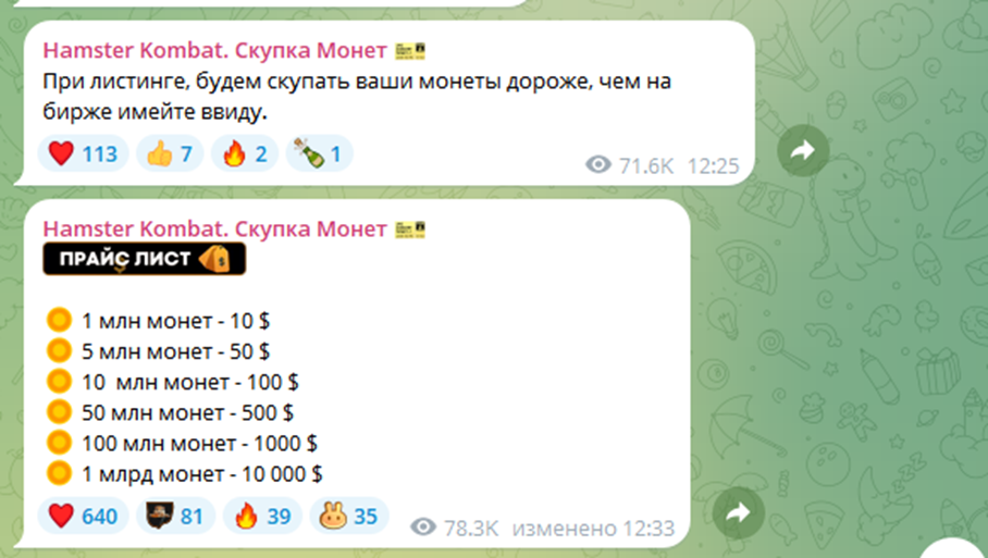 Популярный кликер оброс десятками криптовалютных проектов, пытающихся урвать свой доход от хайпа, “Hamster Kombat Скупка” — один из них. Телеграмм-канал заявляет, что начнет выкупать монеты у подписчиков сразу после официального листинга. Давайте разбираться, насколько велика вероятность выполнения своего обещания, или они даны только для аккумуляции подписчиков для личного заработка на рекламе?