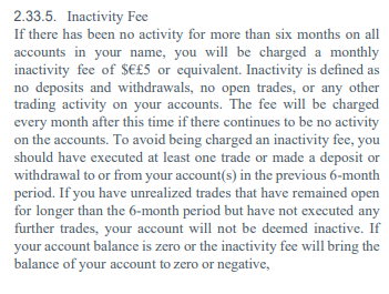 Если аккаунт неактивен полгода, начинают списывать по 5 долларов ежемесячно. Считается, что активности нет, когда отсутствуют сделки, пополнения или выплаты. Просто открытые позиции не спасают от списаний. При нуле на балансе аккаунт закрывают.