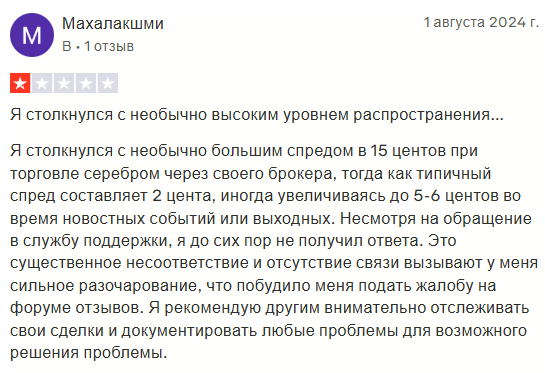Негатив встречается реже, но есть. Жалуются на блокировку доступа к чату поддержки и проблемы с кодами подтверждения. Некоторые недовольны перенаправлением вопросов в другие службы. Один случай – аномальный спред 15 центов на серебре вместо стандартных 2 центов.