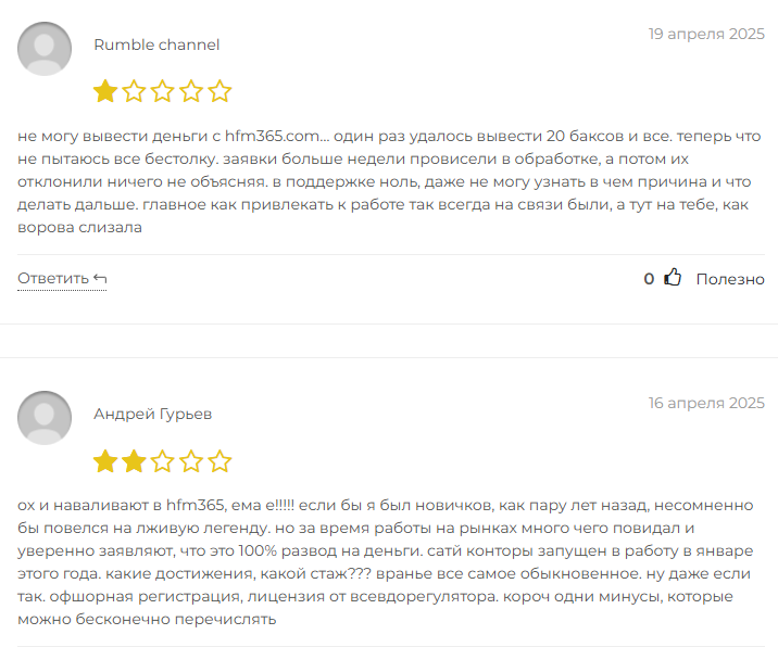 - Отзывы Hfm 365 в основном негативные. Это указывает на соответствующую репутацию проекта. Клиенты, ранее сотрудничающие с компанией, призывают пользователей отказаться от идей сотрудничества с ней.