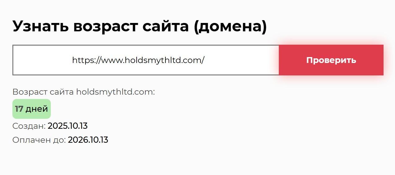 Основатели не пишут, как давно работают. Судя по статистике торгового оборота, которую указывают на сайте, площадке должно быть несколько лет. Однако проверив домен сайта, мы выяснили, что он создан 17 дней назад. Владельцы вводят клиентов в заблуждение.В качестве контактов для связи с техподдержкой указан адрес электронной почты support@holdsmythltd com. Мы проверили: он существует. Номера телефона нет. Упоминается юридический адрес, но по нему такая компания не обнаружена. Официальные каналы в социальных сетях и мессенджерах отсутствуют.
