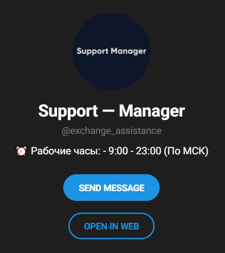 На сайте оставлены единственные контактные данные для связи с саппортом в Телеграмм, с пометкой, что служба поддержки обменника Holopi работает круглосуточно. При переходе по ссылке же видим, что график всё-таки есть. Менеджер на связи только в рабочие часы, а именно с 9:00 до 23:00.