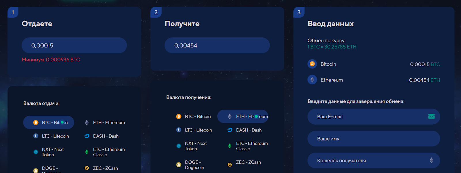 Для обмена на сайте доступны десятки популярных криптовалют. Для каждой операции определены лимиты. Например, для биткоина минимум для обмена составляет 0.000934 BTC. Обмен производится по курсу 1 BTC = 30.25785 ETH, если выбрать соответствующий актив.