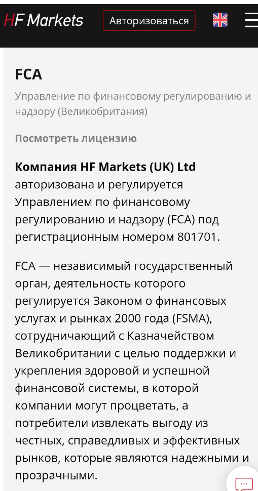 К своему преимуществу брокер относит наличие лицензий CySEC, FCA и других контролирующих органов. На сайте приведены номера лицензий HFM Financial Services, сканов самих документов нет.