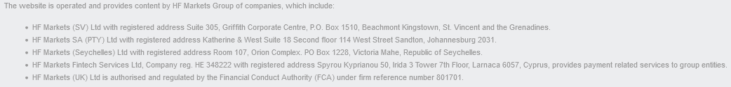 Группа компаний HF Markets (SV) Ltd зарегистрирована в Сент-Винсенте и Гренадинах. На сайте представлены и адреса дочерних организаций компании: HF Markets UK Ltd, HF Markets SA PTY Ltd, HF Markets Seychelles Ltd и HF Markets Fintech Services Ltd.