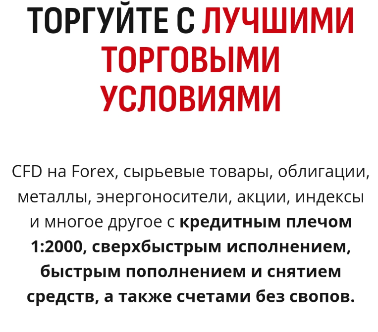 Площадка позволяет торговать с кредитным плечом 1:2000. Доступны облигации, металлы, сырье, энергоносители, индексы, CFD на Forex и пр. Заявлено, что пополнять кошелек и выводить средства клиент может сверхбыстро. Новички могут попробовать свои силы в бесплатном демо-счете.
