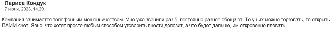 Известно, что брокер занимается и телефонным мошенничеством. Обещания компании меняются с каждым звонком, стимулируя клиента внести депозит.