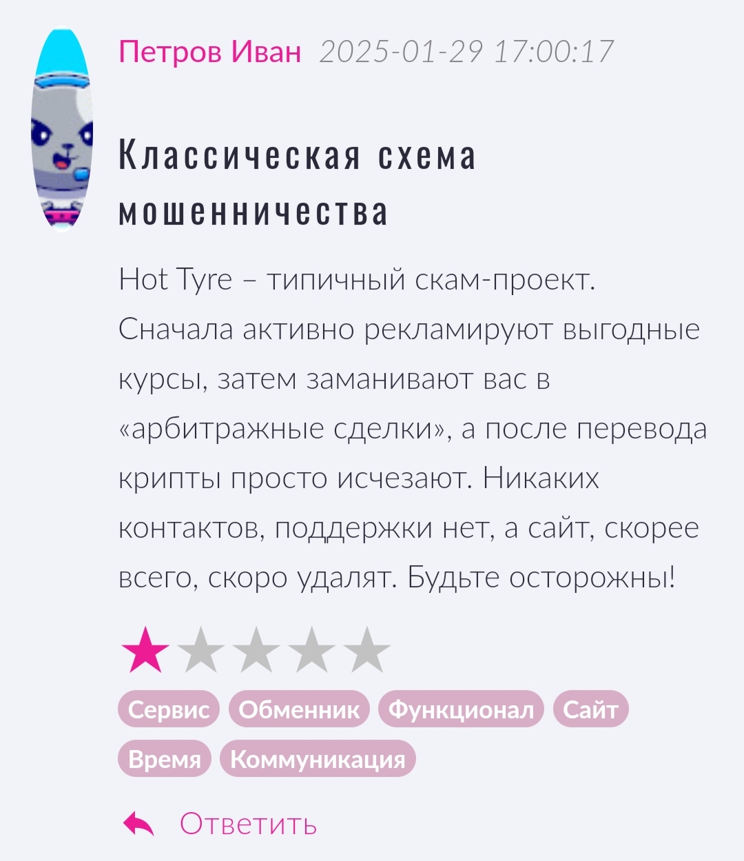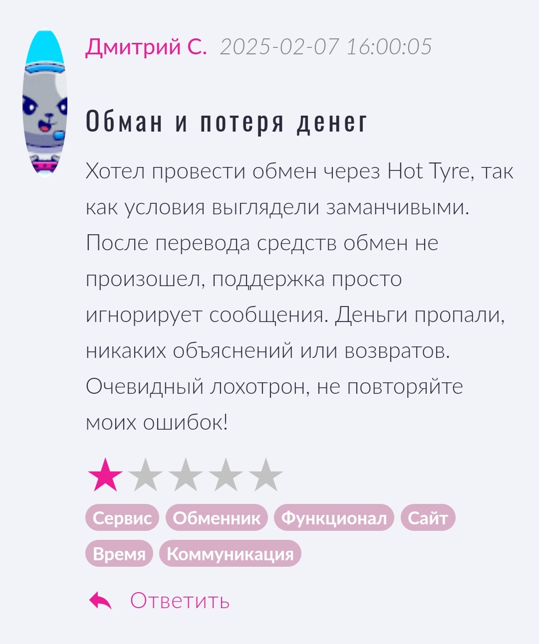 Площадка получила множество оценок, но все отзывы о HotTyre несут негативный характер.