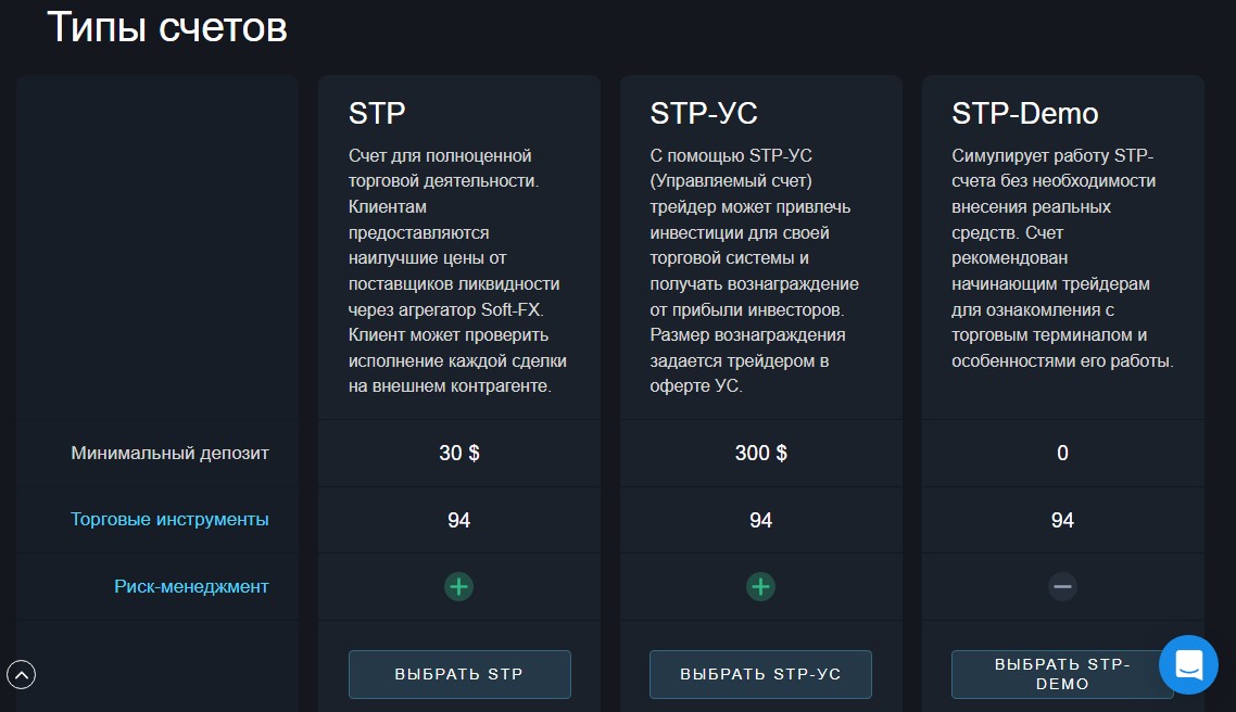 Для трейдинга доступны следующие счета: