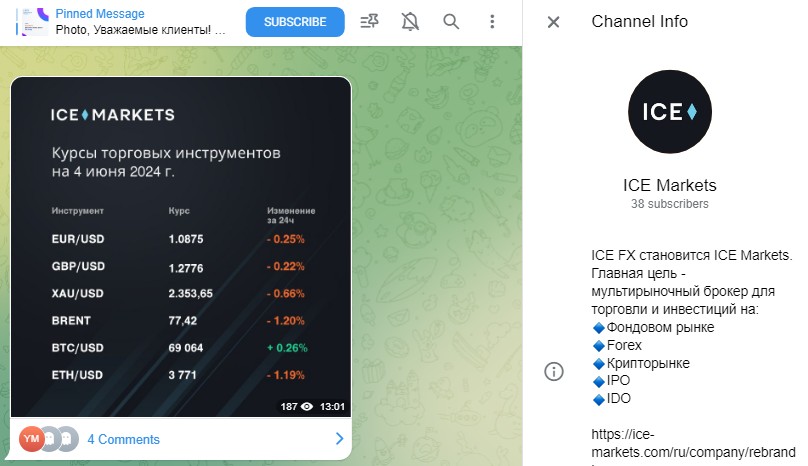 Ice FX также ведет соцсети в Facebook, ВКонтакте и Telegram. Количество подписчиков небольшое, а активность пользователей низкая. Так в Телеграм всего 38 участников, на ВК – 395, а на Фейсбуке – 12. На страницах не публикуются новости, аналитика и другая информация. В ленте регулярно выкладывают скрины с курсами торговых инструментов. По сути, соцсети бесполезны для пользователей.