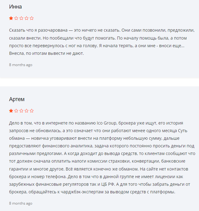 - Скорее всего, брокер не имеет лицензий на ведение своей деятельности. Тем более, их юрисдикция не распространяется в РФ. Также, Ico Group не регулируется «Банком России». Работа может вестись нелегально.