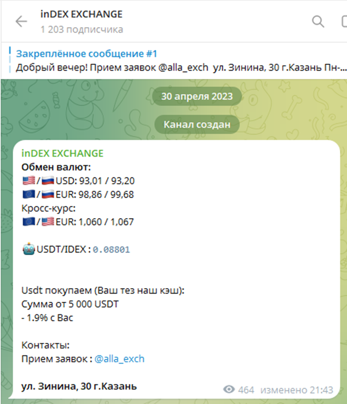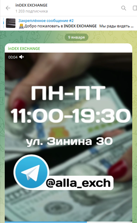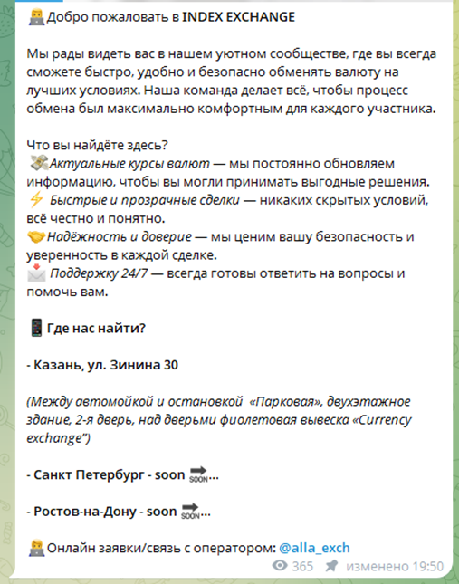 В социальных сетях обменник Index Exchange представлен только в Телеграм. Здесь режим работы обещают 24/7, в отличие от опубликованного внизу сообщения режима работы оператора, который принимает заявки, и в иллюстрациях постов, где написано: 11:00-19:30 с понедельника по пятницу. Обещали открыть обменные пункты в Санкт-Петербурге и в Ростове-на-Дону, но это осталось планами.