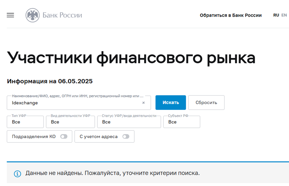 Разработчики Idexchange Net пишут, что еще в 2018 году представили пользователям полностью автоматизированный сервис для обмена криптовалют на самых выгодных условиях. Обмен якобы производится немедленно. Для такого солидного периода работы сервис должен был попасть в списки мониторингов, особенно BestChange, но его там нет. Регистрационные документы или хотя бы номера ИНН и ОГРН отсутствуют. Проверка показала, что лицензия регулятора обменником не получена.