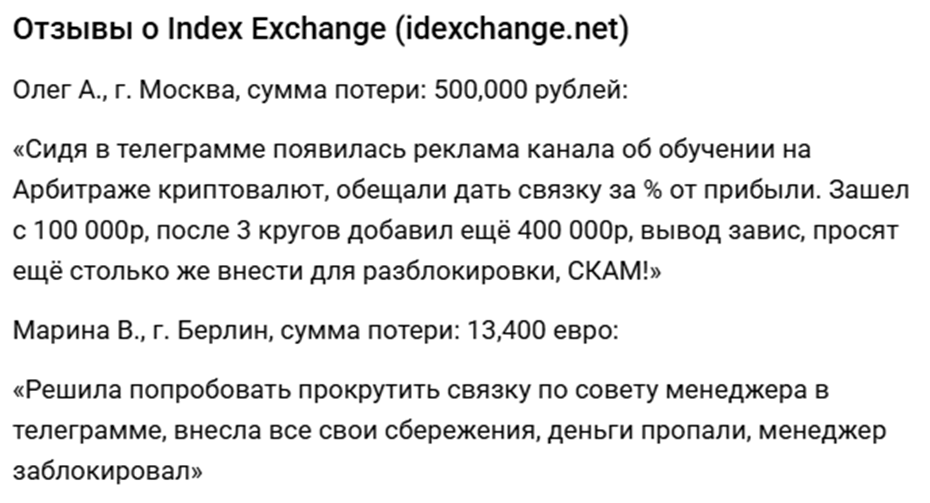 В сети мало отзывов о Index Exchange, но по результатам их изучения становится понятным, что компания предлагает пользователям совсем не те услуги о которых заявлено. Инвесторы вкладывают средства в арбитраж криповалют, но вывести свои сбережения потом не могут. Вначале их просят внести повторно сумму остатка на счете для разблокировки, что невозможно представить в работе с порядочным брокером, а потом в любом случае блокируют.