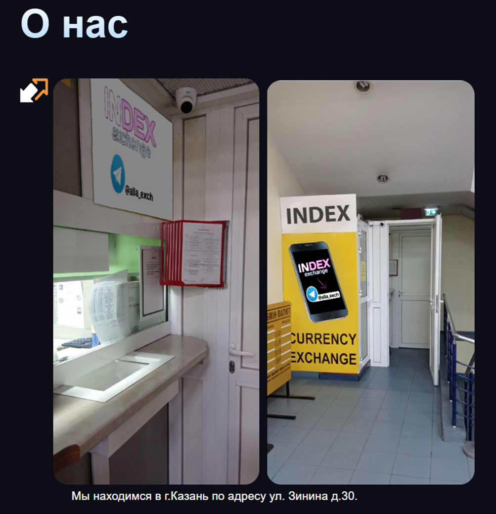 Пишут, что есть физический адрес обменника Index Exchange в городе Казань, улица Зинина, дом 30. Яндекс-карты такой адрес не находят. По неподтвержденным сведениям, на этом месте и с таким адресом идет строительство жилого дома. Представители сервиса пишут, что есть отдельно стоящее двухэтажное здание с вывеской «Currency exchange» между автомойкой и остановкой общественного транспорта, видимо, временное незарегистрированное строение.