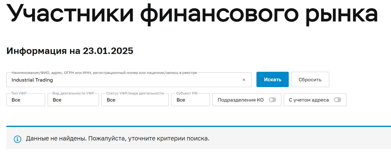 • Industrial Trading org не имеет лицензий на территории РФ, что делает невозможным возврат средств, так как они не отслеживаются, из-за чего создается ощущение того, что ожидания от сотрудничества не будут оправданы.