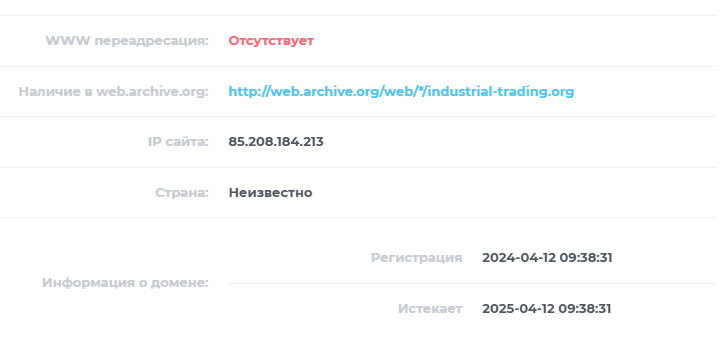 Industrial Trading org не имеет много открытой информации в интернете, что затрудняет ознакомление с проектом, однако изучить сайт нужно обязательно. С помощью бесплатного сервиса 2IP, можно выяснить когда домен был зарегистрирован. Отсюда, узнаем, что проект существуют максимум 1 год, что создает ощущение риска того, что ожидания от сотрудничества не оправдаются.
