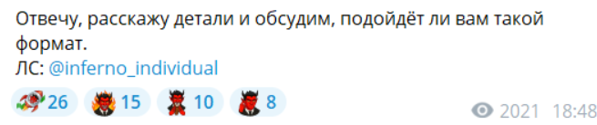 На канале у Inferno Individual набралось более 4 500 подписчиков. Сколько участников у него в закрытой группе – не уточняется.