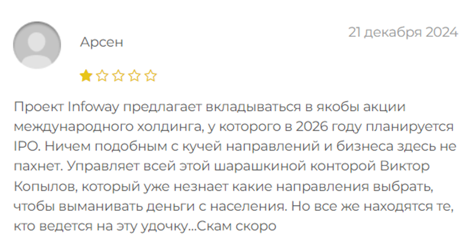 В интернете все отзывы о платформе негативные. Люди пишут, что потеряли свои деньги, так как не смогли вывести ни прибыль, ни вложенный депозит. Клиенты платформы остались недовольны и скрытностью команды, и условиями заработка в проекте. Комментаторы в отзывах называют площадку InfoWay Marketing «пирамидой» и «скамом» и не советуют переходить на нее для торговли и заработка.