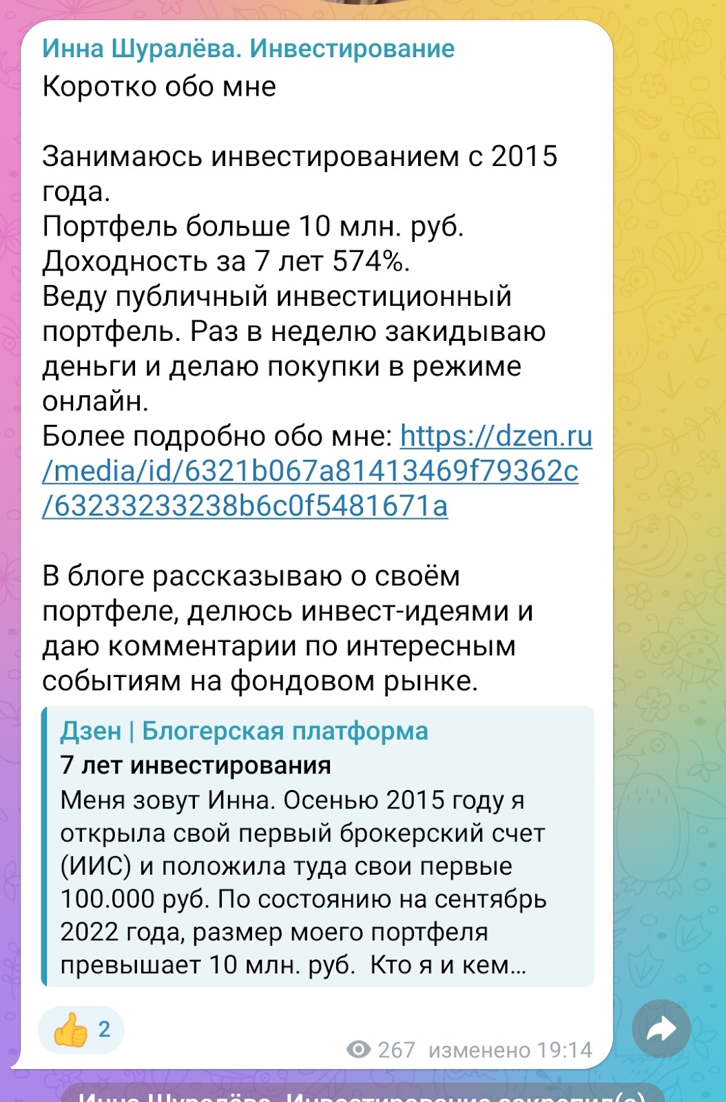 Последние посты на канале Инны Шуралевой были в декабре 2024 года. Автор позиционирует себя как опытного инвестора с портфелем больше ₽10,000,000, который обозревает компании, дает комментарии по рынку, а также предлагает свои инвест-идеи. Связаться с инвестором можно через личный профиль в Телеграмме с ником innashuraleva.